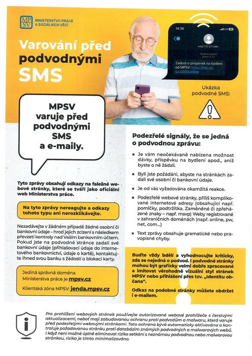 Ministerstvo práce a sociálních věcí varuje před podvodnými SMS a e-maily, které se tváří jako oficiální web Ministerstva práce. Na tyto zprávy nereagujte a odkazy tohoto typu ani nerozklikávejte.